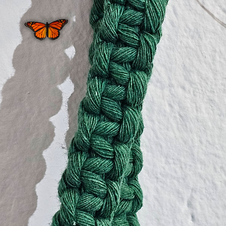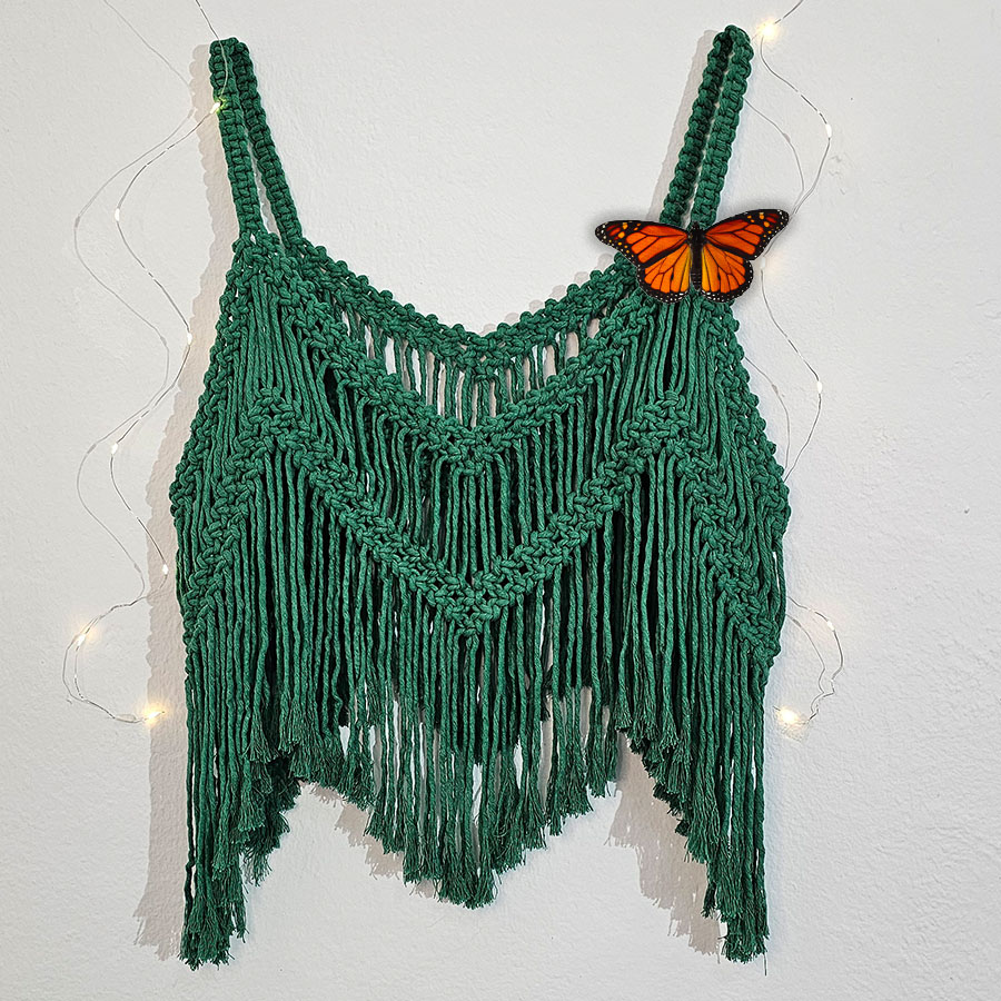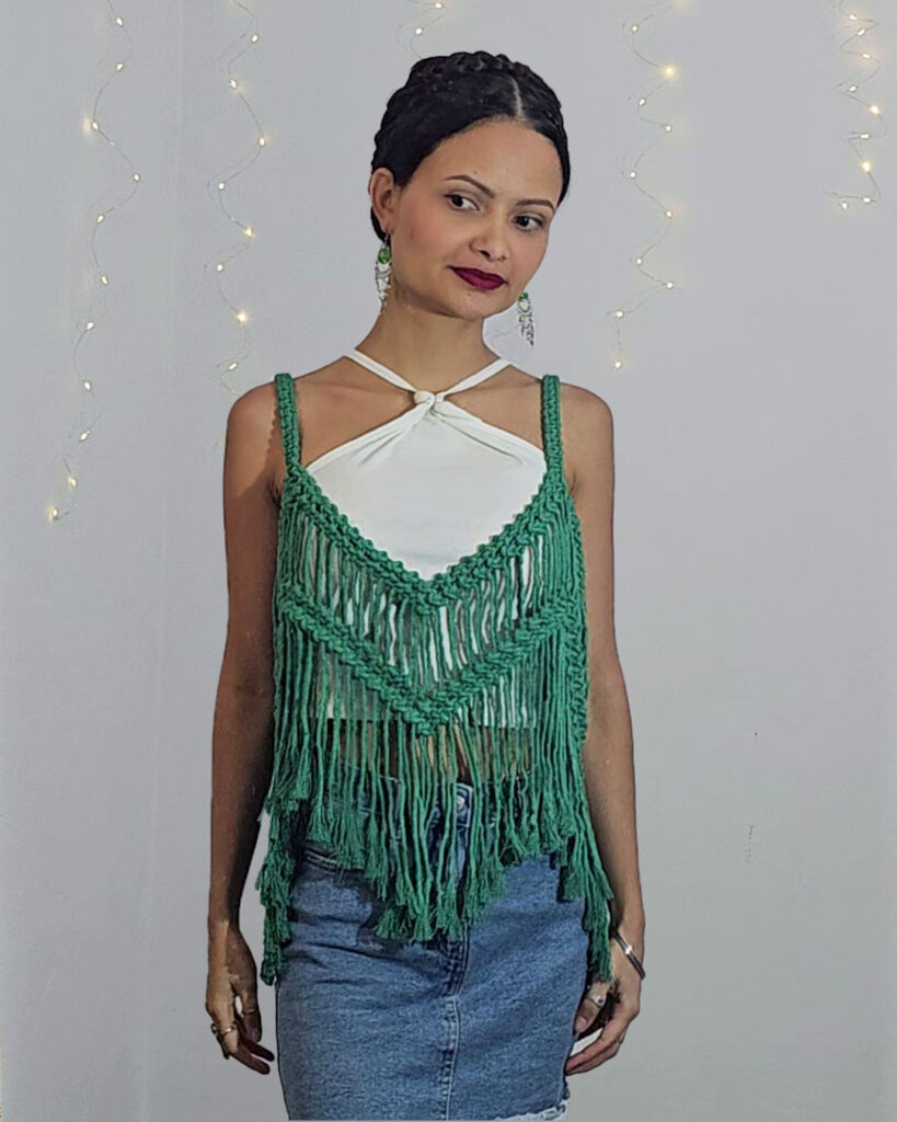 Inspirado en el deseo de llevar esta pieza en mi propia piel, el verde (mi color personal) apareció como una extensión natural del proceso. El verde simboliza crecimiento, equilibrio y renovación. Es el color del corazón que se expande en armonía con la tierra. Este top encarna la energía de lo vivo, de lo que crece sin prisa pero con fuerza. Esta pieza esta cargada de energía vital, acompañando a quien lo habite a enraizarse en su poder desde el equilibrio y conexión con el flujo de la naturaleza.