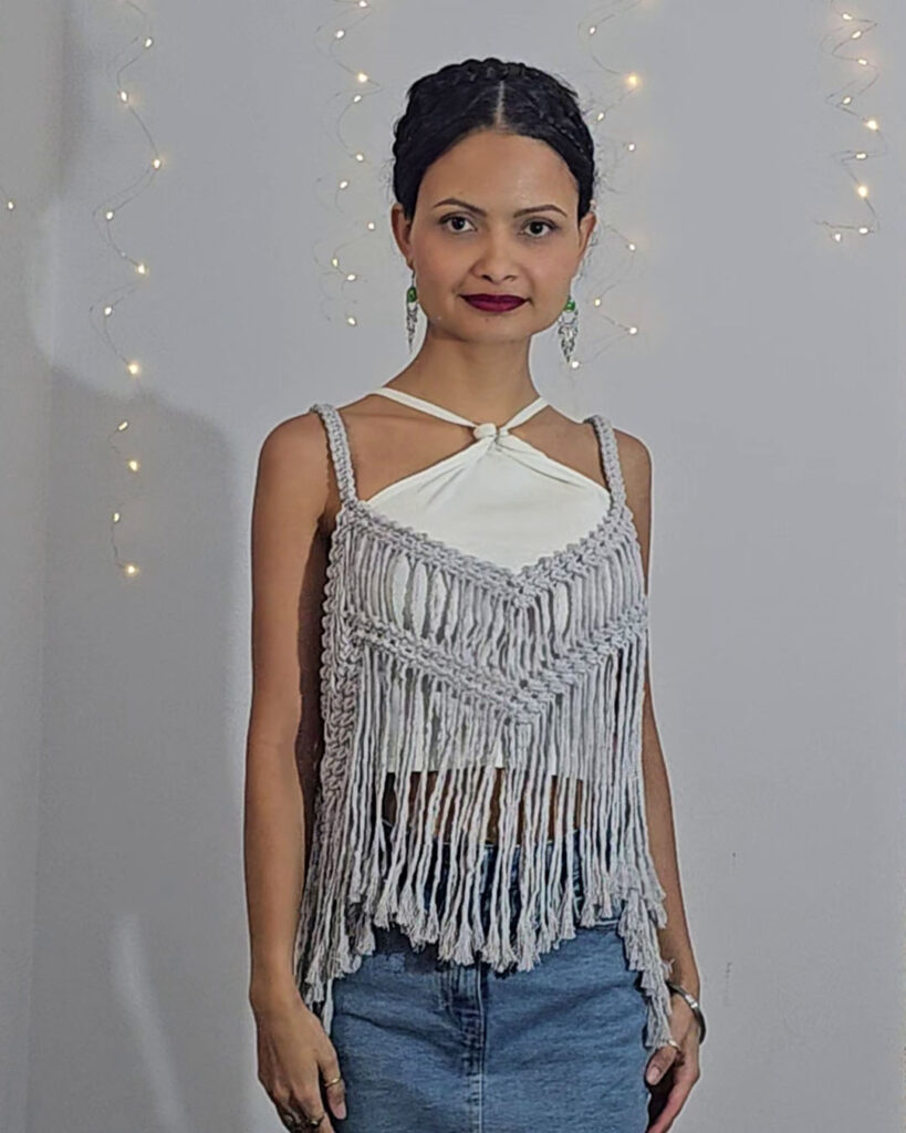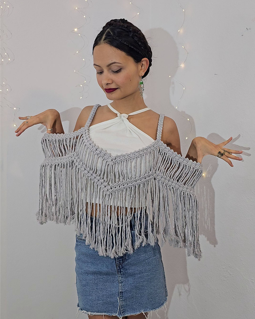 El gris, un color elegido por un llamado invisible. El gris es el punto de encuentro entre la luz y la sombra. Este color representa equilibrio, neutralidad y profundidad. Es el punto medio entre extremos, el punto donde todo puede comenzar. Creado con una energía de escucha y apertura, esta pieza parece haber encontrado su camino incluso antes de ser terminada. Es un top para la mujer que transita el cambio. Invitándola a honrar sus procesos internos y entender que la transformación también puede verse suave.