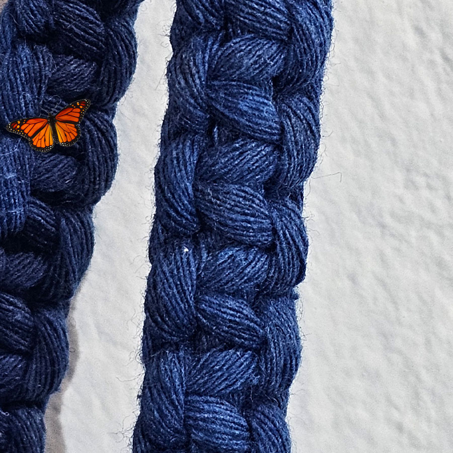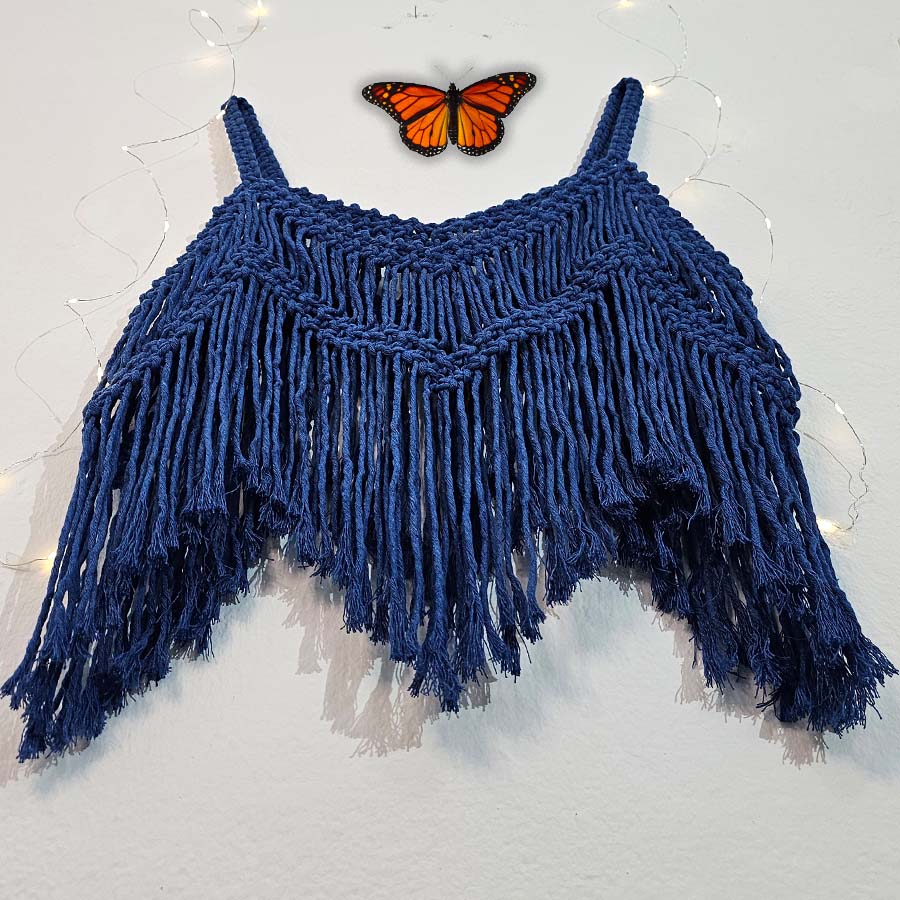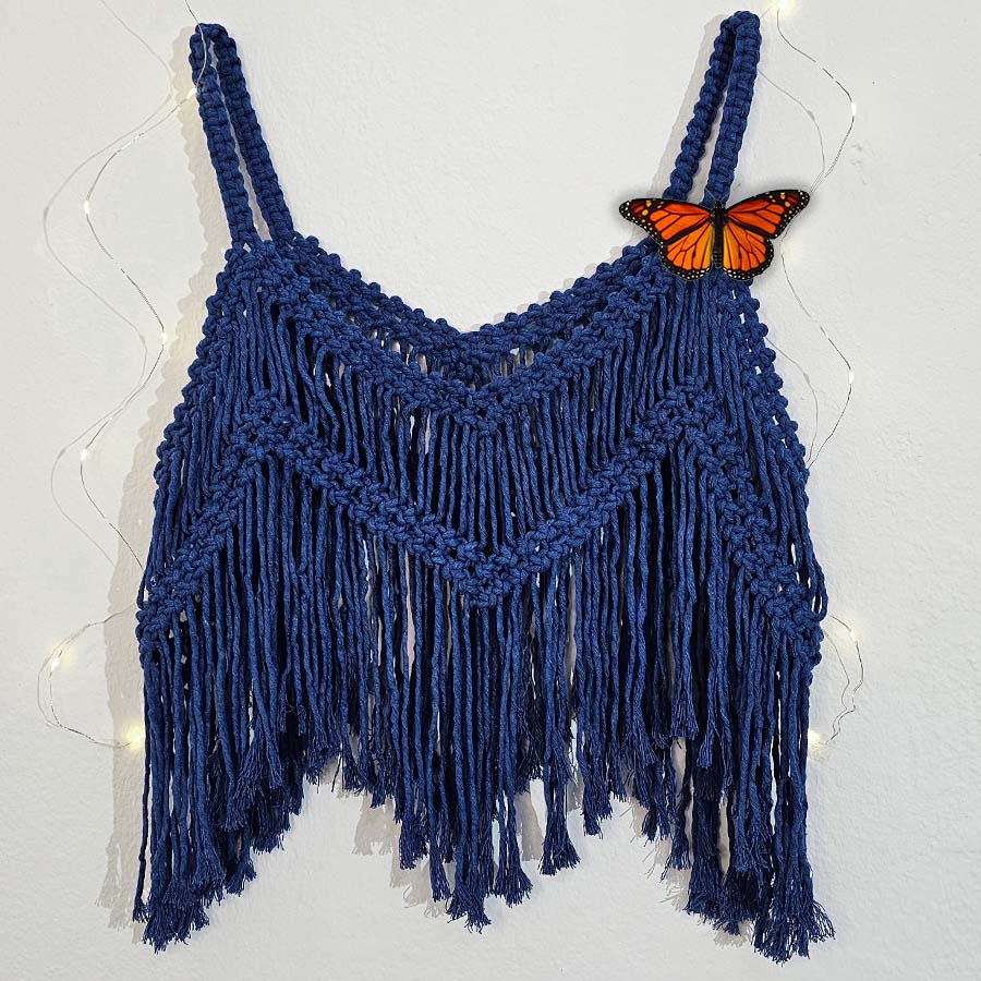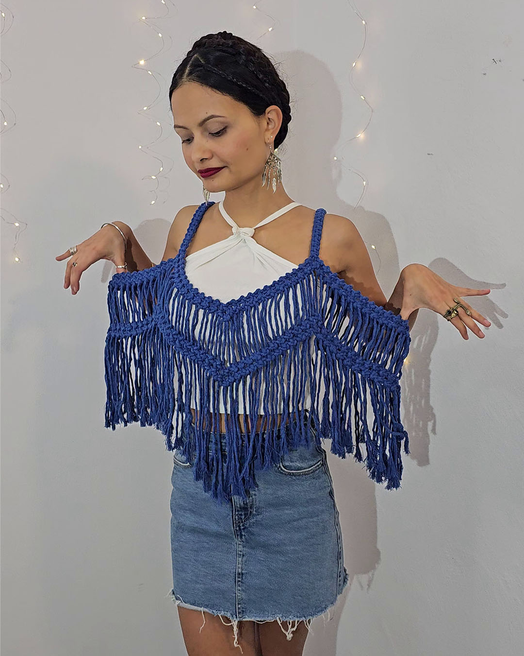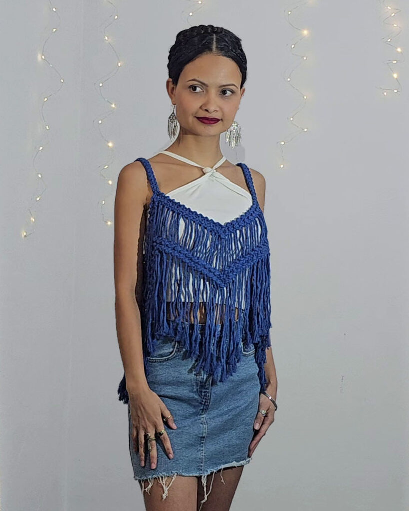 Esta pieza fue un ensayo que se convirtió en revelación. Azul, el color que me llamó para iniciar este viaje. Cada nudo fue creado en estado de presencia, y el resultado final tiene una cualidad hipnótica, como si la forma se hubiera manifestado por sí sola. El azul profundo está asociado a la calma, la confianza y la claridad interior. Es el color del silencio que sostiene, del océano y del cielo cuando se vuelven infinitos. Este top invita a su dueña a fluir con su propia intuición, a sentirse segura en su esencia, y a caminar con su poder interior.